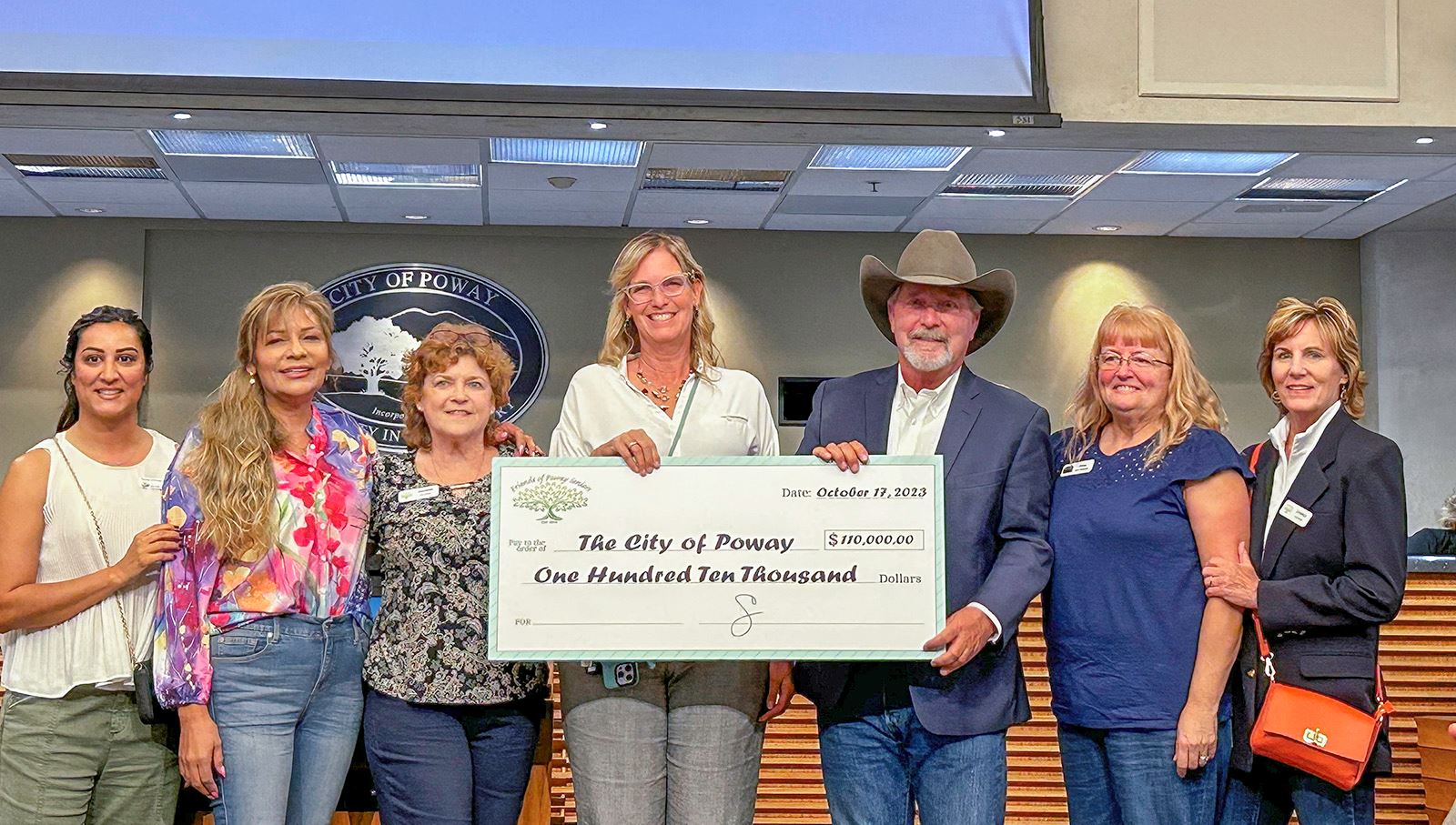 At the October 17 Poway City Council meeting, the organization that once operated as the Poway Senior Center presented Poway with a check for $110,000 in support of the city’s older adult programming and announced a $143,000 pledge to benefit the congregate meal program available Monday through Friday at the Mickey Cafagna Community Center.